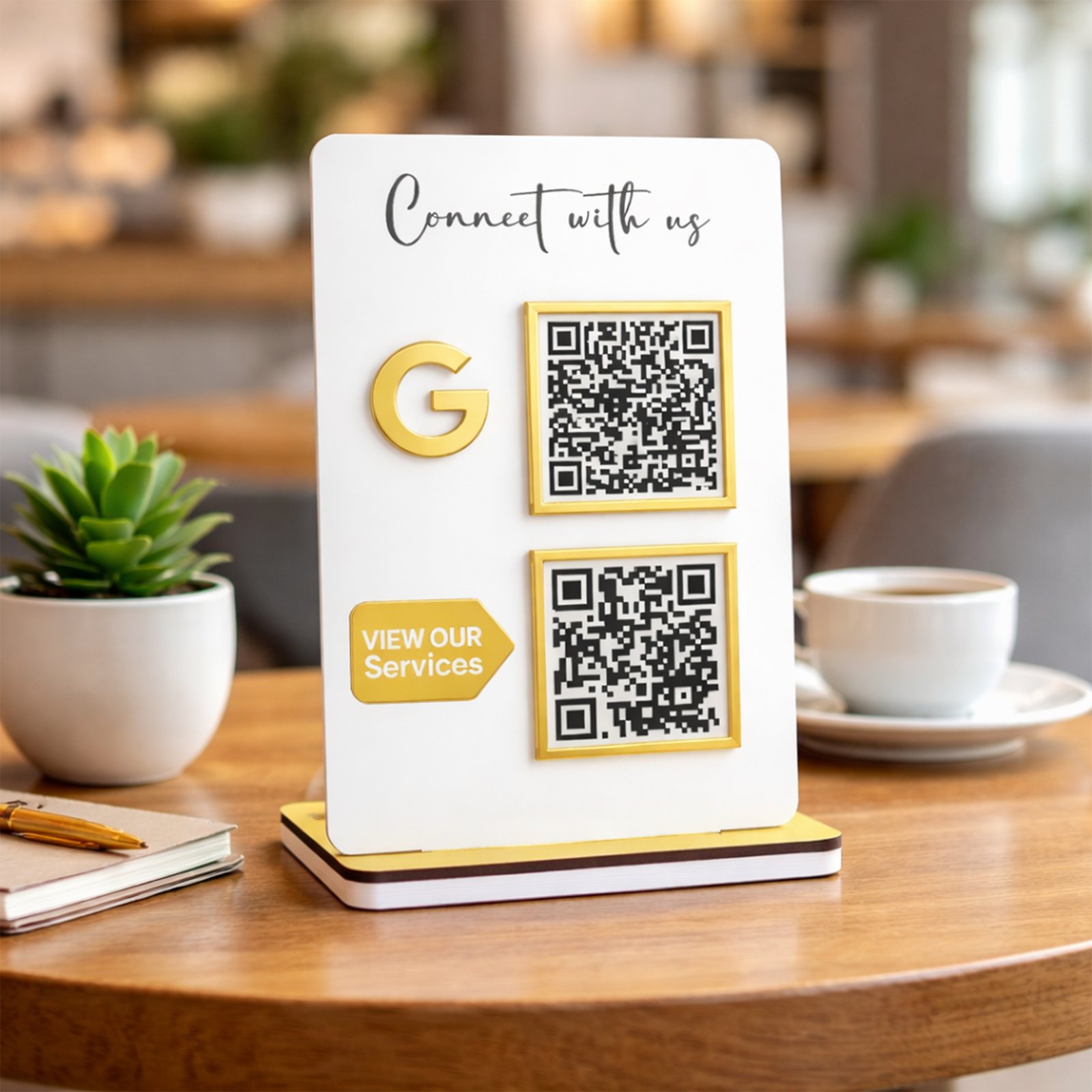 - Two QR codes in one stand: Digital Catalog + Google Review