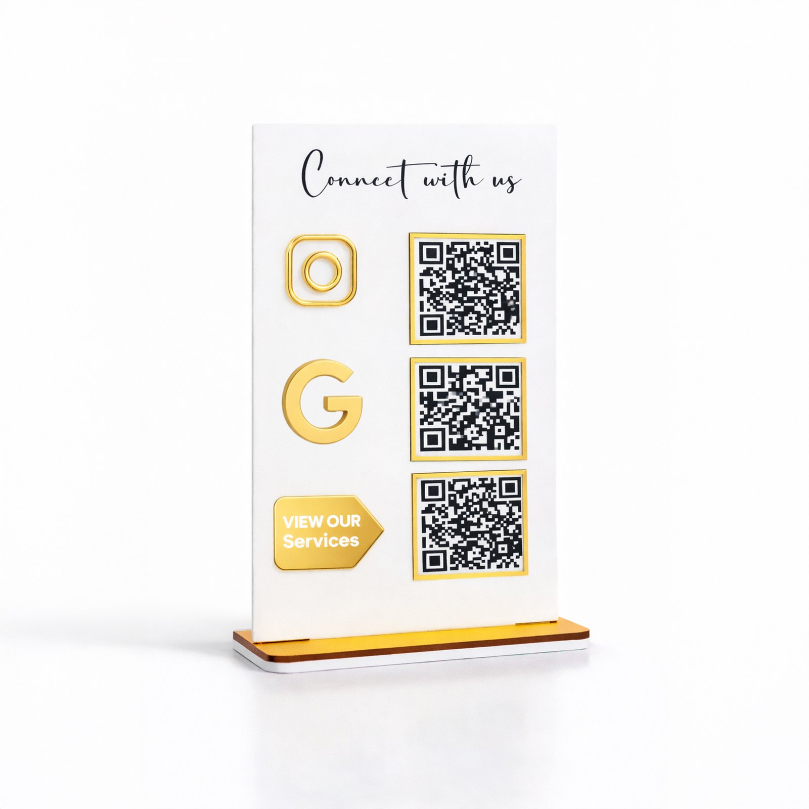 - Three QR codes in one stand: Digital Catalog + Google Review + Instagram