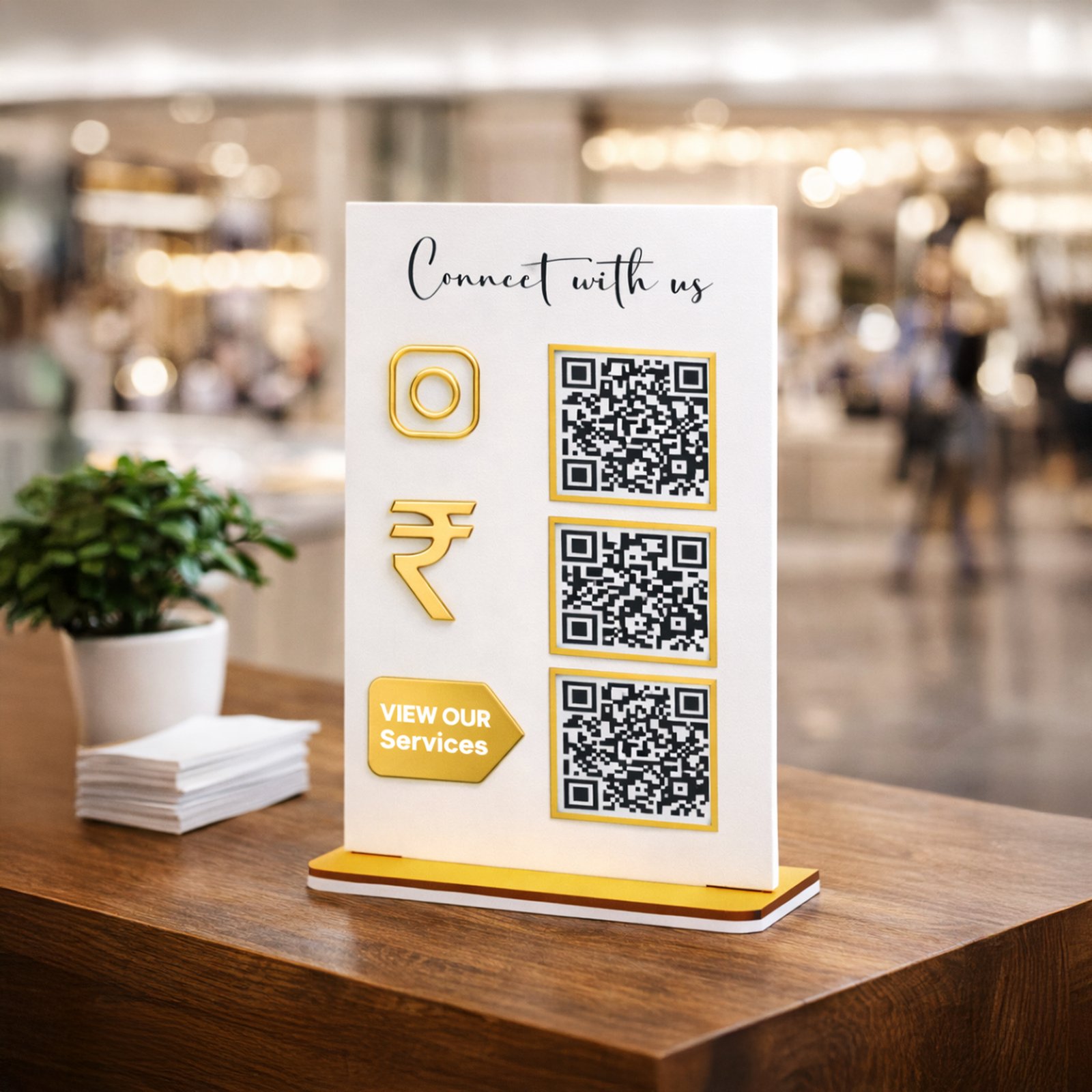 Upgrade your in-store branding and simplify customer buying journeys with the QR Premium Digital Catalog, Instagram & Payment Stand. Customers can browse your digital catalog, visit your Instagram profile, and make instant UPI payments by scanning the three QR codes—no app download, no hassle. Just scan, explore, follow, and pay in seconds.
