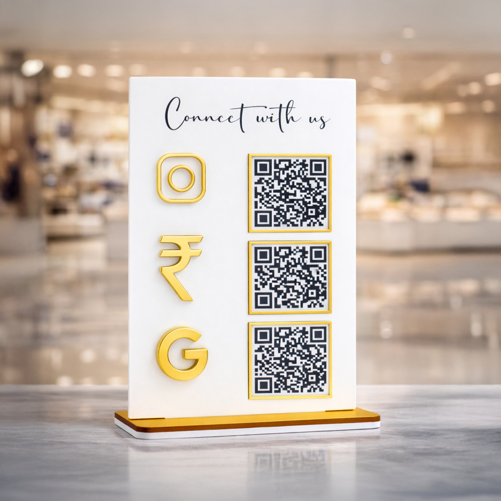 Upgrade your in-store branding and simplify customer engagement with the QR Premium Google Review, Instagram & Payment Stand. Customers can leave a Google review, visit your Instagram profile, and make instant UPI payments by scanning the three QR codes—no app download, no hassle. Just scan, review, follow, and pay in seconds.