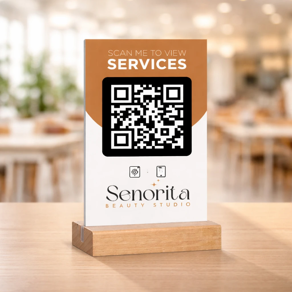 Upgrade your in-store branding with the Wooden Base Digital Catalog Acrylic Stand. Customers can instantly visit your Services by scanning the QR code - no app required.