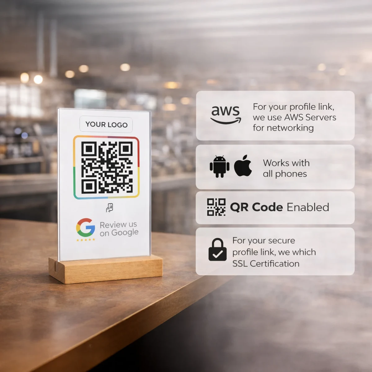 The elegant acrylic display with a premium wooden base adds a modern yet classy touch to your counter while helping you collect more positive Google reviews effortlessly.